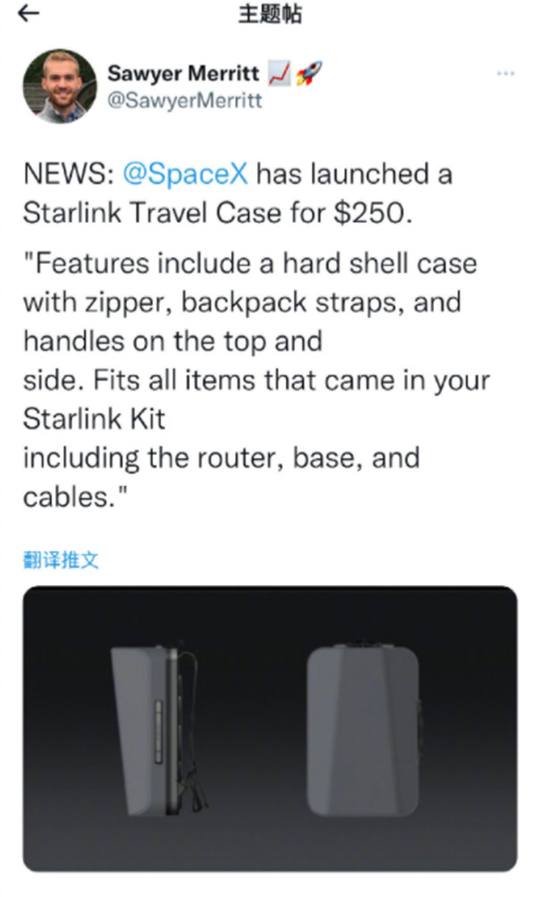 近日,海外博主Sawyer Merritt在社交媒体上称,马斯克旗下的SapceX推出了一款售价250美元(约合人民币1687元)的Starlink旅行箱。