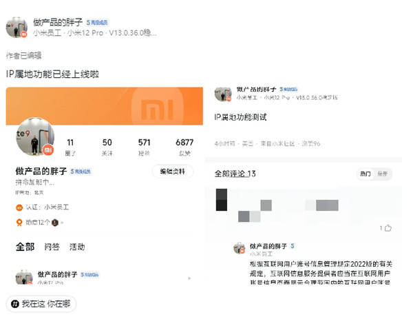 从图片中可以看出,在小米社区的个人主页中,IP 属地会展示在用户昵称下方。同时,用户发帖、回复时都会展示用户的 IP 属地。