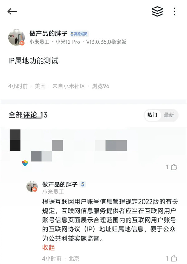 据小米员工介绍,小米社区上线 IP 属地功能是根据互联网用户账号信息管理规定 2022 版的有关规定。该规定指出,互联网信息服务提供者应当在互联网用户账号信息页面展示合理范围内的互联网用户账号的互联网协议(IP)地址归属地信息,便于公众为公共利益实施监督。