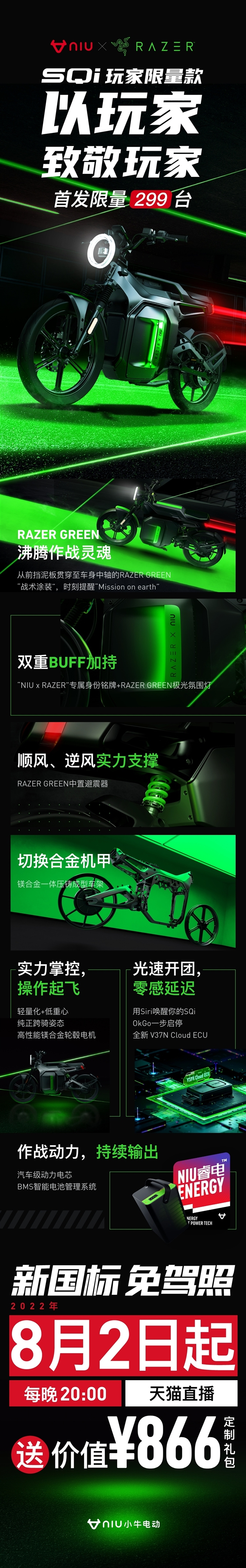 此外,联名款在电池仓的两侧加装了“NIUxRAZER”的定制名牌,并引入了雷蛇堪称招牌的荧光绿氛围灯,颇具代表性。