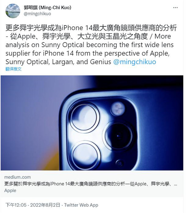 8 月 3 日消息,今天分析师郭明錤发布了更多关于舜宇光学成为 iPhone 14 系列最大广角镜头供货商的分析 — 从苹果、舜宇光学、大立光与玉晶光之角度进行了报告预测。