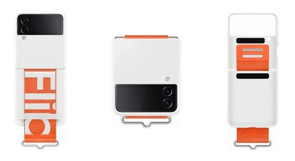 Galaxy Z Flip4的手机壳采用硅胶材质制作,并且还配有彩色系带,上面印有白色“Flip”字样,可以在需要时确保牢固抓握手机,平时也可以当做装饰,十分有辨识度。