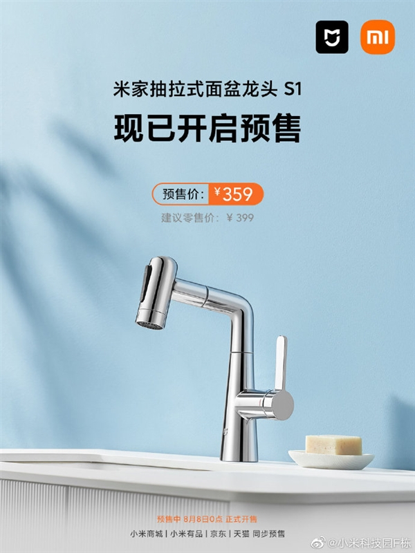 2、米家抽拉式面盆龙头S1,售价359元。特色:上涌喷泉水,花式洗漱