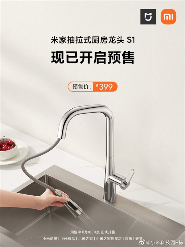 3、米家抽拉式厨房龙头S1,售价399元。特色:劲猛冲、刷、洗,厨房清洁无压力