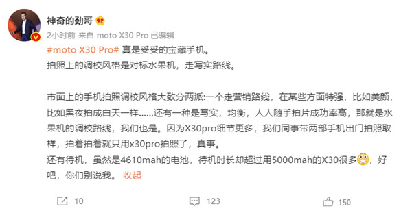 今日,联想中国区手机业务部总经理陈劲发文表示,moto X30 Pro真是妥妥的宝藏手机。拍照上的调校风格是对标水果机,走写实路线。
