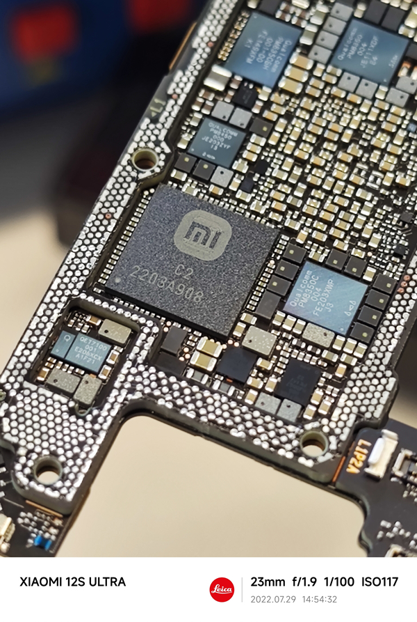 你以为这就完了?据数码博主“楼斌Robin”拆解发现,小米12S Ultra其实还有一颗澎湃C2,隐藏在双层主板中间,很难发现。