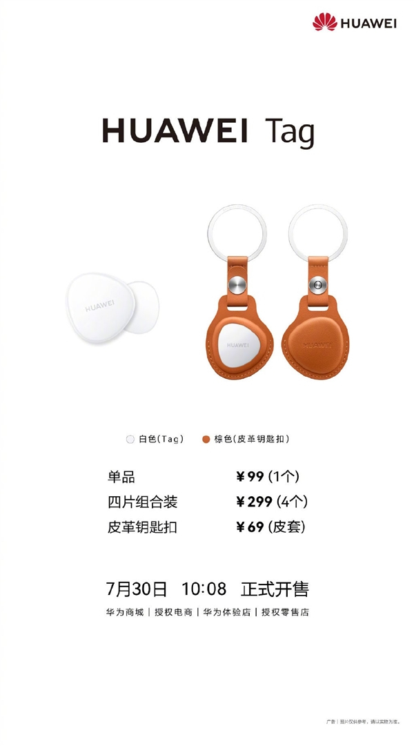 根据华为官方消息,HUAWEI Tag防丢精灵将于今天上午10:08正式开售,售价单个装为99元,四个装为299元,同时还有皮套可选,售价69元。
