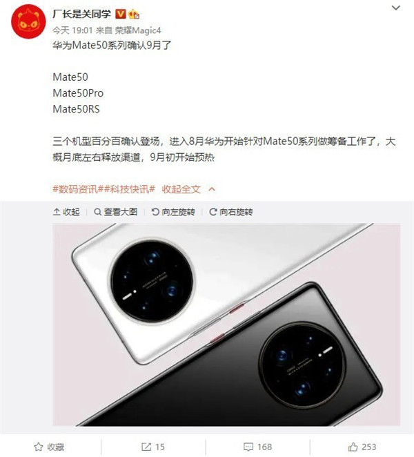 近日,有博主爆料称,华为Mate 50系列确定将于9月发布,同时还确认了华为Mate 50系列将首发三款机型——Mate 50、Mate 50 Pro和Mate 50 RS,8月做筹备工作,9月开始预热。