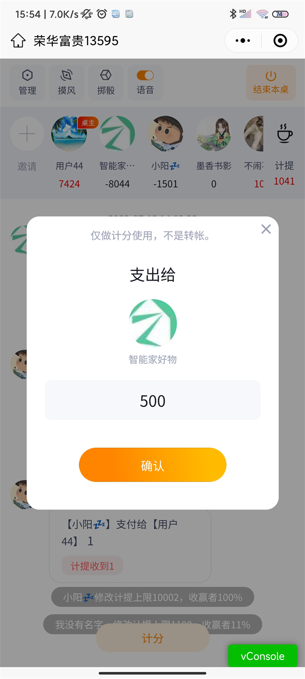 进入小程序后,有三种计分桌子,其中多人计分桌子更适用于麻将,进入后桌主可以邀请牌友进入一起计分。当我们输了谁多少分,就点击对方的头像,输入分数,还可打开语音功能,计分的时候就会有出**的提示。