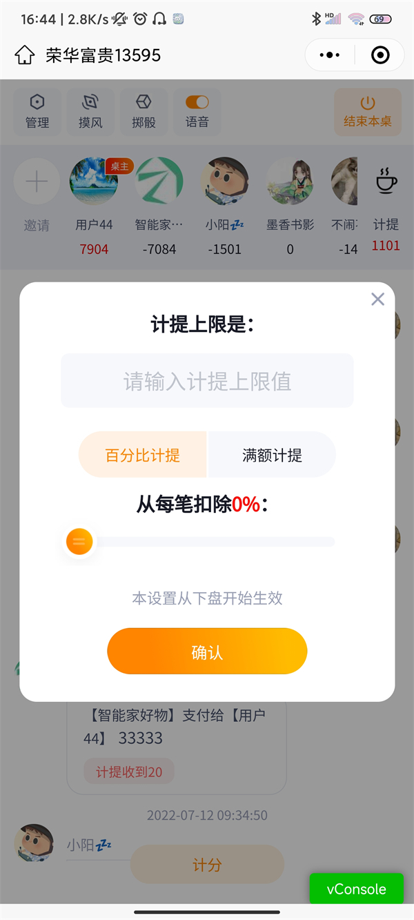进入桌子后,可以选择百分比计提和满额计提的方式,设置计提上限,用于公共支出与消费。牌局结束,点击结束本局,自己一共支出多少,收入多少,一目了然。