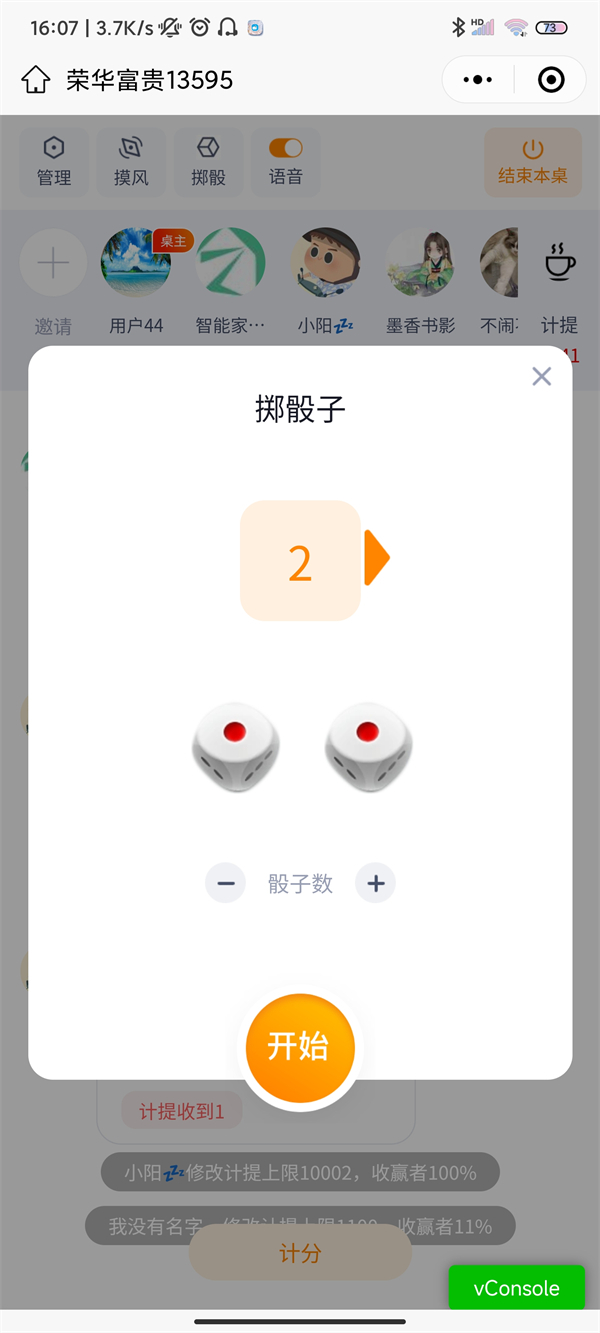 遇上部分不靠谱的牌友了,还可以使用计分器提供的掷骰功能。选择需要的骰子数,点击开始即可通过第三方打骰,规避部分牌友喜欢作弊的风险。