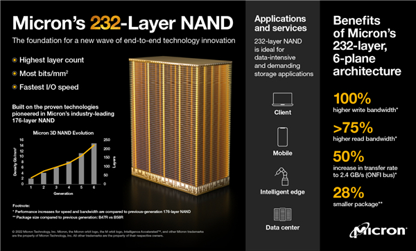 指标方面,美光表示其232层TLC闪存引入了业内最快的IO速度,可达2.4GB/s,比上代的176层闪存高出50%,同时写入带宽提升100%,读取带宽提升75%。