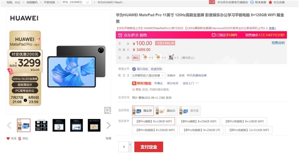今天,华为MatePad Pro 11在华为京东自营旗舰店开启预售,支付定金100元可抵300元,实付起售价为3299元。