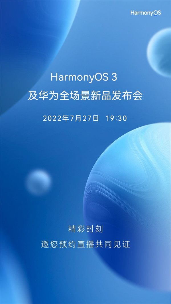 7月26日上午9点,华为手机官方微博再次预热了将于明晚19:30举行的HarmonyOS 3及全场景新品发布会,邀用户一同见证这款新系统所带来的的全新UI设计以及实用功能。