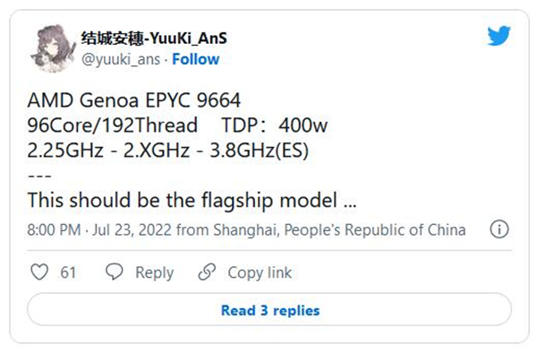 基于 Zen 4 的 AMD EPYC 9000 “Genoa” CPU 阵容完整规格在数周前曝光之后,今天国内知名数码博主@結城安穗-YuuKi_AnS 发布推文,分享了该系列旗舰型号 EPYC 9664 的规格信息。