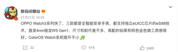 据此前爆料,OPPO Watch 3 系列全智能手表想做长续航,分为 OWW211/212/213 三个型号,高屏占比微弧方表盘设计,有黑色银色深灰色淡金色,功能该有的都有。在微博博主@数码闲聊站 称,“OPPO Watch 3 系列快来了,三款都是全智能安卓手表,都支持独立 eUICC 芯片的 eSIM 技术,首发 4nm 骁龙 W5 Gen 1 芯片,尺寸和前代差不多,高配的铂黑和棕色金色做工质感不错,ColorOS Watch 系统提升不小。”