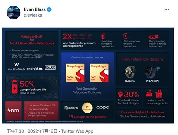 近日,爆料人士@evleaks曝光了即将发布的高通骁龙W5/W5+Gen 1手表可穿戴芯片,并且和智能手机移动平台一样,启用了全新的命名方式:第一代骁龙W5+、第一代骁龙W5。