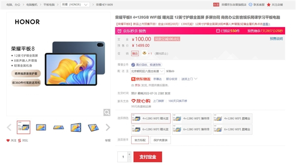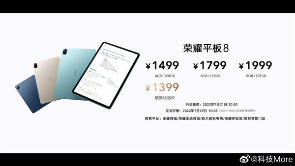 今天,荣耀平板8在京东自营旗舰店开启预售,有4GB+128GB、6GB+128GB和8GB+128GB三种选择,首销价分别是1399元、1799元和1999元,新品将于7月29日正式发售。