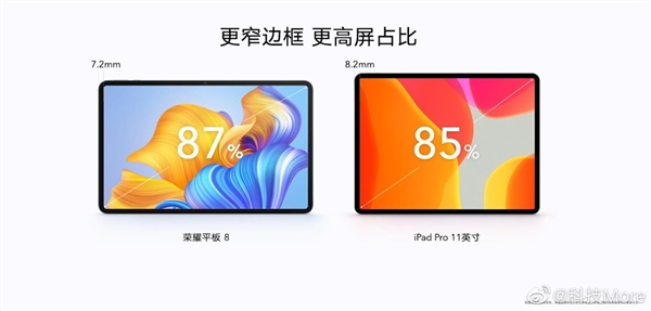 荣耀平板8采用12英寸护眼全面屏,边框只有7.2mm,屏占比达到了87%,比iPad Pro边框更窄、屏占比更高(iPad Pro 11英寸边框8.2mm,屏占比85%)。