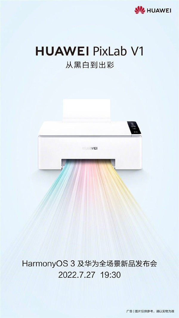 据悉,华为终端官方微博宣布将于7月27日发布华为打印机PixLab V1,从海报不难看出,这款打印机支持彩色打印,是华为旗下第一款彩色打印机。