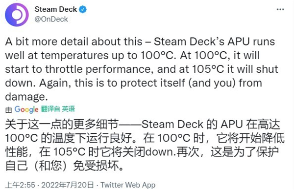 根据Valve的说法,在0-35℃的环境下,Steam Deck可以正常使用,高温环境下该设备会下调性能以确保正常使用,但是Steam Deck的APU温度超过105℃的话,就会自动关机,以保护设备不受损坏。