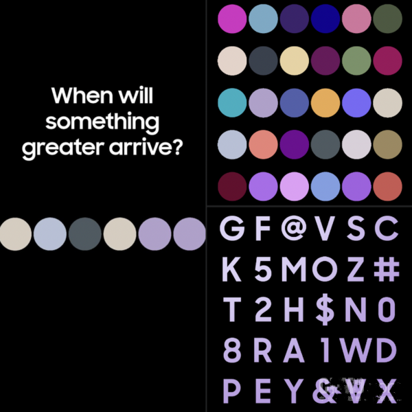 三星在第一张图片中,写上“When will something greater arrive?”,下方有六个圆形色块;第二张图片中放上了30个圆形色块;第三张图片中则是放入30个字母数字与符号。聪明的你,看得出来要如何解开这个谜题吗?