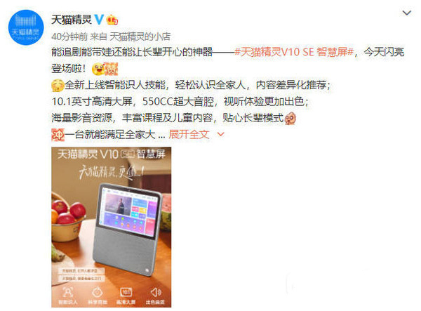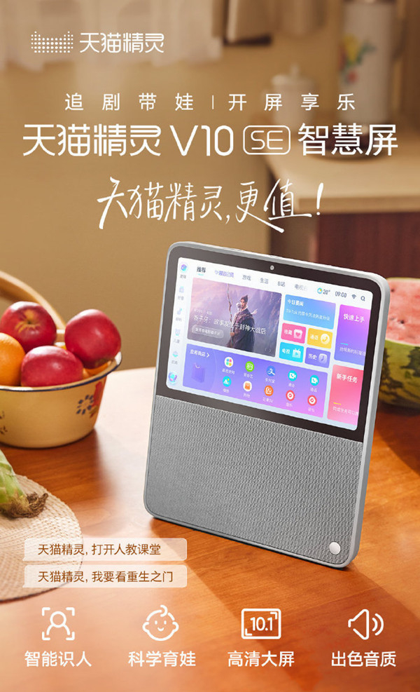 7月19日,天猫精灵官方宣布,能追剧能带娃还能让长辈开心的神器——天猫精灵V10 SE智慧屏今天闪亮登场啦!该音箱全新上线了智能识人功能,能够轻松认识全家人,进行内容差异化推荐;配备了一块10.1英寸高清大屏、550CC超大音腔,视听体验更出色;内置海量影音资源、丰富课程及儿童内容,还有贴心长辈模式,一台就能满足全家大小需求,售价899元。