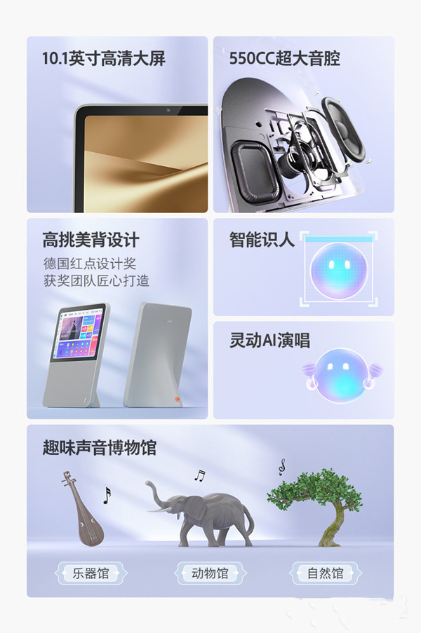 具体配置上,天猫精灵V10 SE智慧屏配备了一块10.1英寸IPS全视角高清大屏,采用12度倾角设计,视线无死角、观影更舒适。音箱音腔容积达550CC,还原度高,音质澎湃饱满。低音频段覆盖60Hz,音色层次更清晰。内置海量课程资源、趣味声音博物馆以及丰富儿童内容,并搭载了专业级MiraVision护眼芯片,能够智能控制屏幕蓝光发光量,呵护儿童眼睛。
