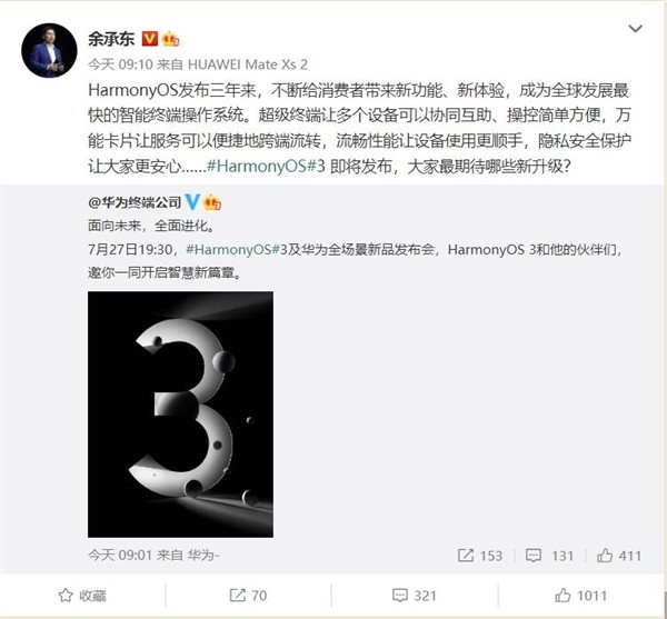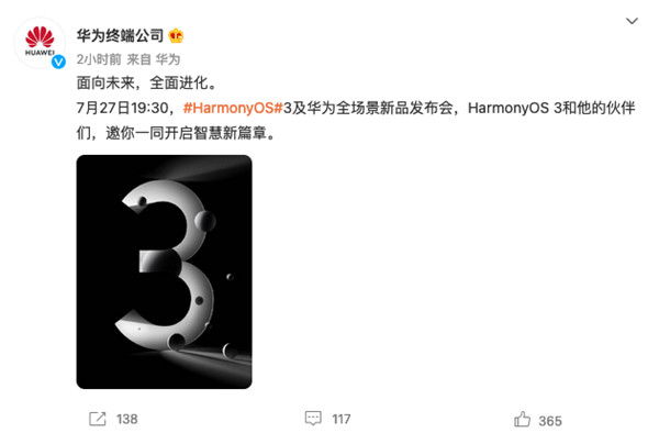 据了解,华为将在7月27日举办新品发布会,HarmonyOS 3和智能设备将会同台亮相。这一消息已经发出就直接冲上了微博热搜榜,足见用户对这款系统的关注度有多高。