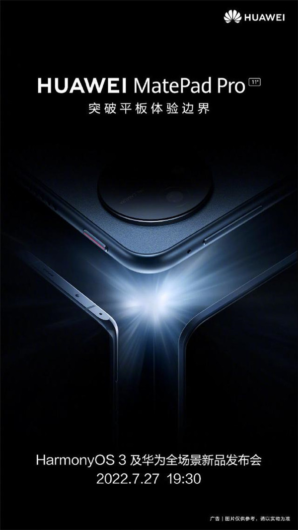 7 月 19 日消息,华为将于 7 月 27 日举行 HarmonyOS 3 及华为全场景新品发布会,届时会发布多款新品,今天官方公布了其中一款新品 ——2022 款华为 MatePad Pro 11 英寸平板电脑,号称“突破平板体验边界”。