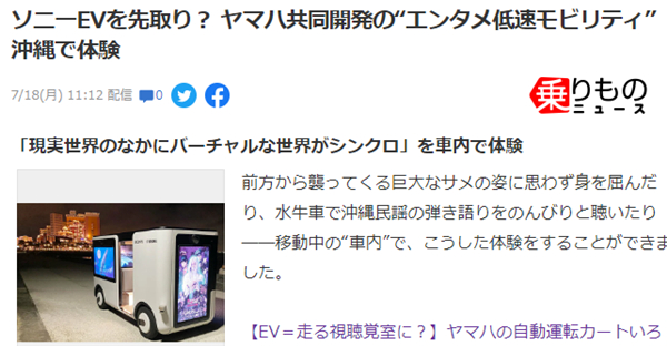 •这种名为《Sociable Cart》目前正在冲绳县北谷町试运行中,造型前卫科幻的小车里搭载了最新的虚拟真实裸眼体验系统,乘客可以在车内体验到真是街景与虚拟CG相结合的奇妙景象。