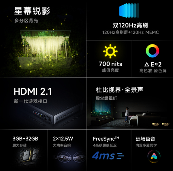 和早些时候发售的86寸版本一致,此次ES Pro系列的三款新品也支持120Hz高刷屏+120Hz MEMC双高刷,最高700尼特亮度,并通过多分区背光系统为每个分区都带来了4096级明暗变化。