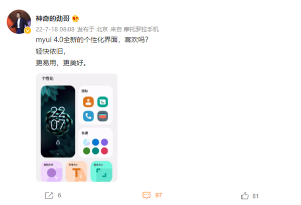 此外,陈劲曾表示,MYUI 4.0将会与moto X30 Pro一同登场。MYUI 4.0将会采用全新的Logo,并且具有动态变色效果。