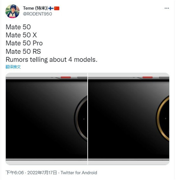 渲染图显示,Mate 50和Mate 50 Pro机身尺寸基本一致,不过主摄有所区别,少了一饿摄像头,补光灯造型也不同;Mate 50 Pro和Mate 50 X设计基本一致,只是Mate 50 X尺寸更大;Mate 50 RS和Mate 50 X基本一致,不过主摄星环为金黄色。