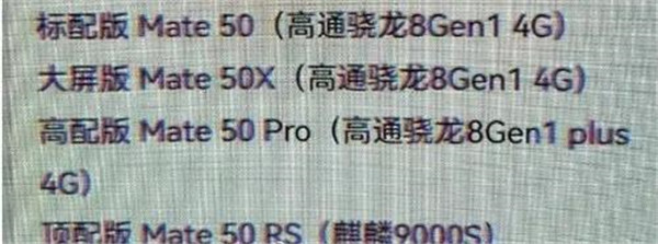 据传言,华为Mate 50将在9月发布,全系一共有4款,分别为华为Mate 50、Mate 50 X、Mate 50 Pro和顶配版Mate 50 RS,而这四款所使用的芯片也正式公布,如下图: