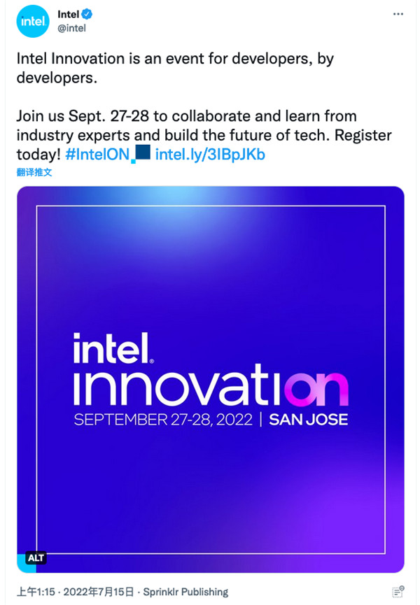 近日,Intel在Twitter上发文称将于9月27-28日举行下一场“创新”(Intel Innovation)活动,这场活动最值得期待的无疑是其第13代Raptor Lake台式机/Sapphire Rapids至强处理器。