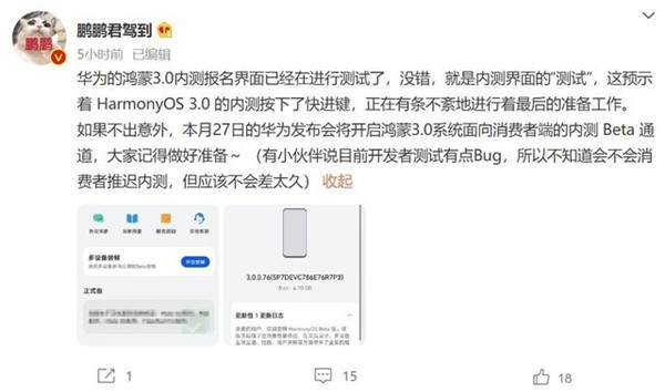 近日,数码博主@鹏鹏君驾到爆料,华为的鸿蒙3.0内测报名界面已经在进行测试了,没错,就是内测界面的“测试”,这预示着 HarmonyOS 3.0 的内测按下了快进键,正在有条不紊地进行着最后的准备工作。