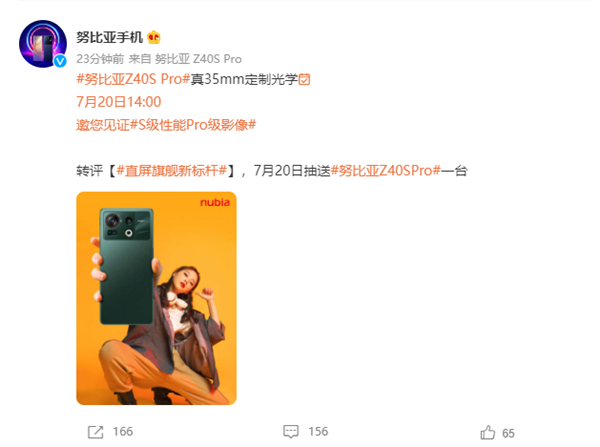 努比亚将于7月20日发布新机努比亚Z40S Pro,官方称该机将会是“直屏旗舰新标杆”,在影像上也将有优秀表现。