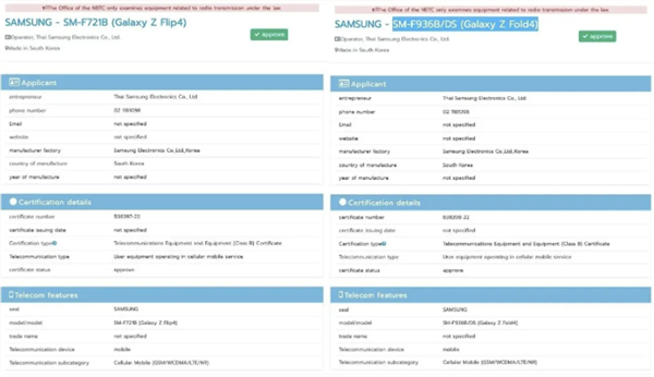 继通过 FCC 认证之后,Galaxy Z Fold 4 和 Galaxy Z Flip 4 近日再次现身泰国监管机构 NBTC,两款手机的型号分别为“SM-F936B”和“SM-F721B”。两款可折叠手机均运行 Android 12 系统,但预估在发布之后可以升级到 Android 13。
