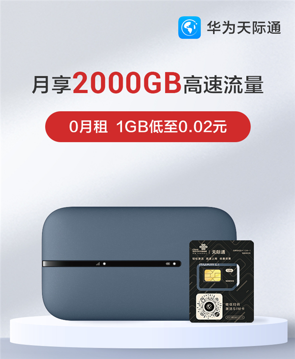 华为天际通团队与中国联通合力打造的流量卡,月享2000GB全国流量,月包99元,年包599元,1GB低至0.02元。通过“天际通Go”微信小程序即可实现快速开卡和再次充值,非常方便。