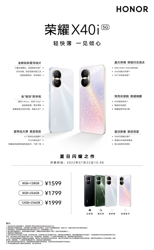 价格方面,荣耀X40i 8GB+128GB版本售价1599元,8GB+256GB版本售价1799元,12GB+256GB版本售价1999元,将于7月22日正式开售。