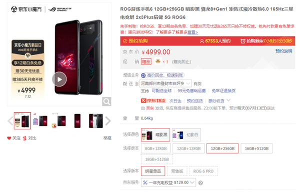 目前,腾讯ROG游戏手机6已经上架正式开卖,其中8GB+128GB版本3999元、12GB+128GB版本4499元、12GB+256GB版本4999元、16GB+512GB版本5799元,有暗影黑、幻影白两种配色。