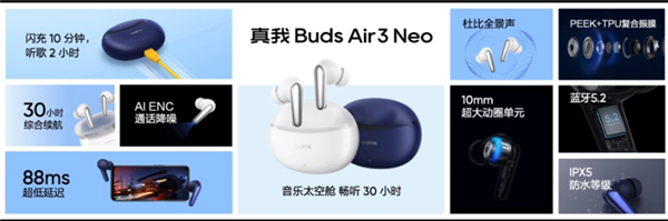 在续航方面,真我Buds Air3 Neo标称可连续畅听30小时,号称“挑战耳机续航天花板”。这款耳机还支持闪充,只需10分钟就能听歌2小时。