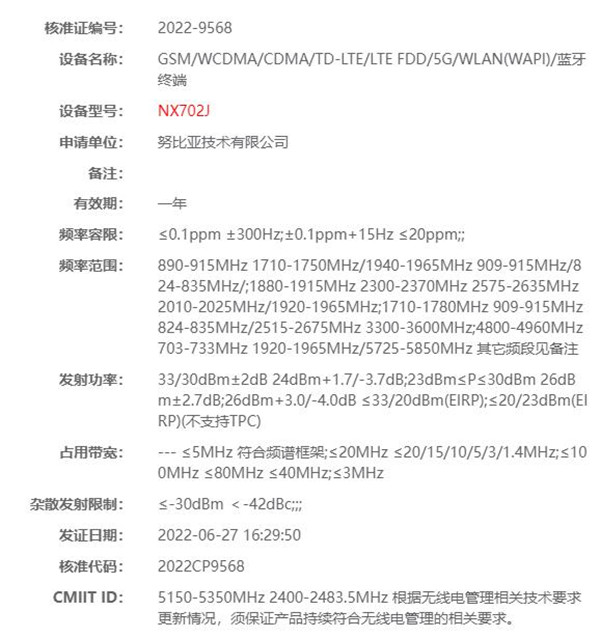 一款型号为 NX702J 的努比亚新机目前已通过无线电核准,预计为即将发布的 Z40S Pro。