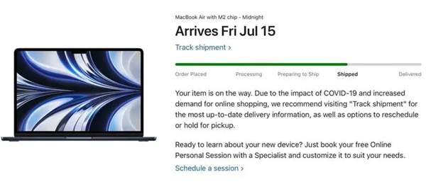 M2 MacBook Air 首批订单已经开始发货。消息称苹果已经向一些预计 7 月 15 日交货的客户发送发货通知。虽然预订用户在状态一栏中可能依然显示为“采购中”,但可以通过 UPS My Choice 或通过快递号来追踪您即将到来的包裹。