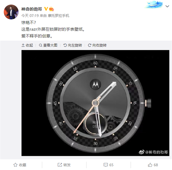今日,联想中国区手机业务部总经理 陈劲晒出了一张Razr外屏在锁屏时的手表壁纸,预计正是即将发布的摩托罗拉Razr 3。