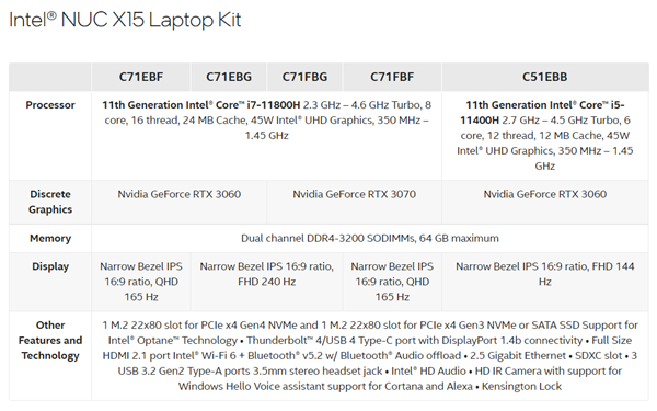目前的NUC X15笔记本基于11代酷睿H系列,包括i7-11800H、i5-11400H,显卡则可选RTX 3060、RTX 3070。