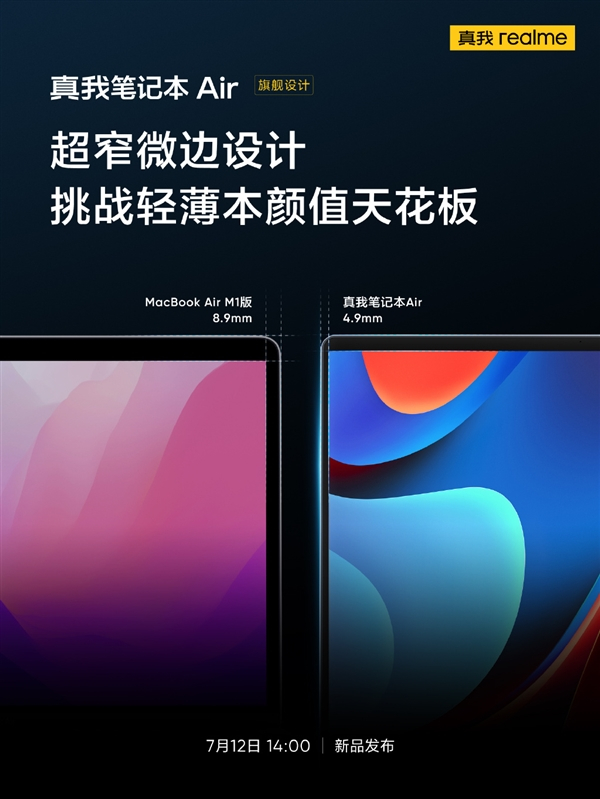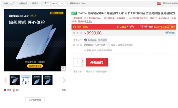 今日消息,真我笔记本Air在京东自营旗舰店上架接受预约,新品将于7月12日登场。