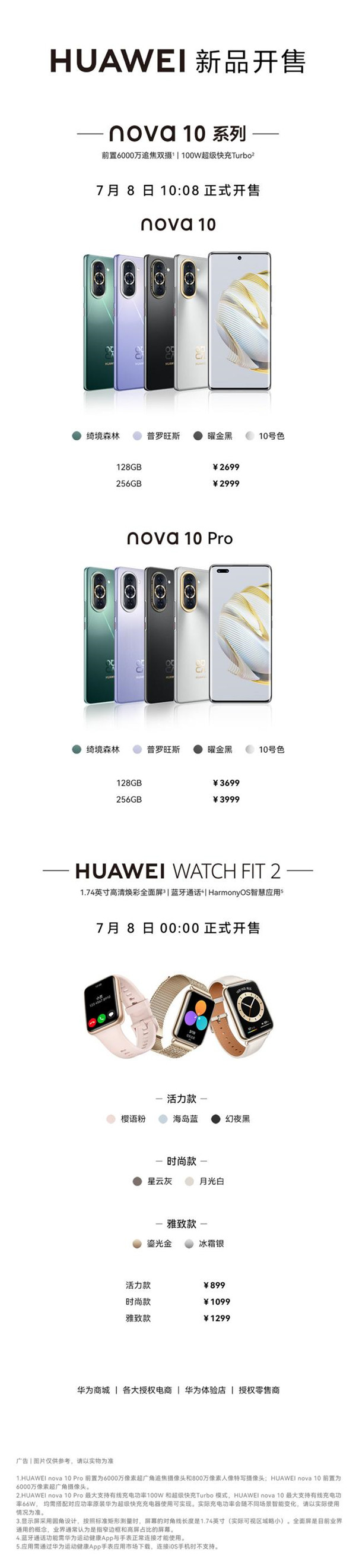 7 月 8 日消息,华为宣布,今日华为 nova10 系列、华为 WatchFIT 2 等多款新品正式开售,其中华为 nova 10/10 Pro 系列今日下午正式发布,搭载高通骁龙 778G 4G 处理器,2699 元起。
