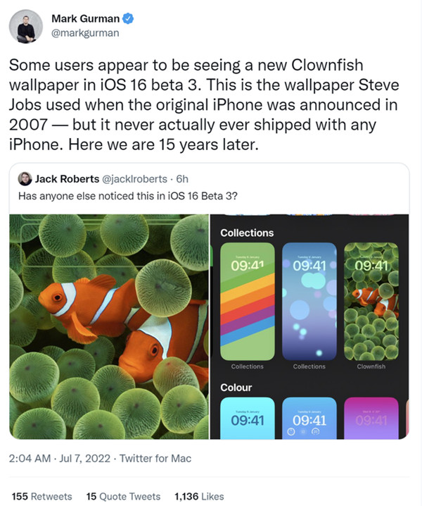 针对相关信息,彭博社记者马克古尔曼(Mark Gurman)表示,部分用户在 iOS 16 beta 3 中看到了全新的小丑鱼壁纸选项。这是史蒂夫乔布斯(Steve Jobs)在 2007 年发布初代 iPhone 时使用的壁纸,但该壁纸实际上从未在 iPhone 上正式推出。